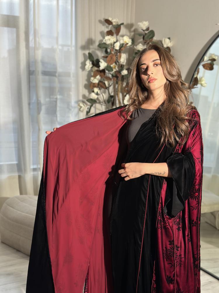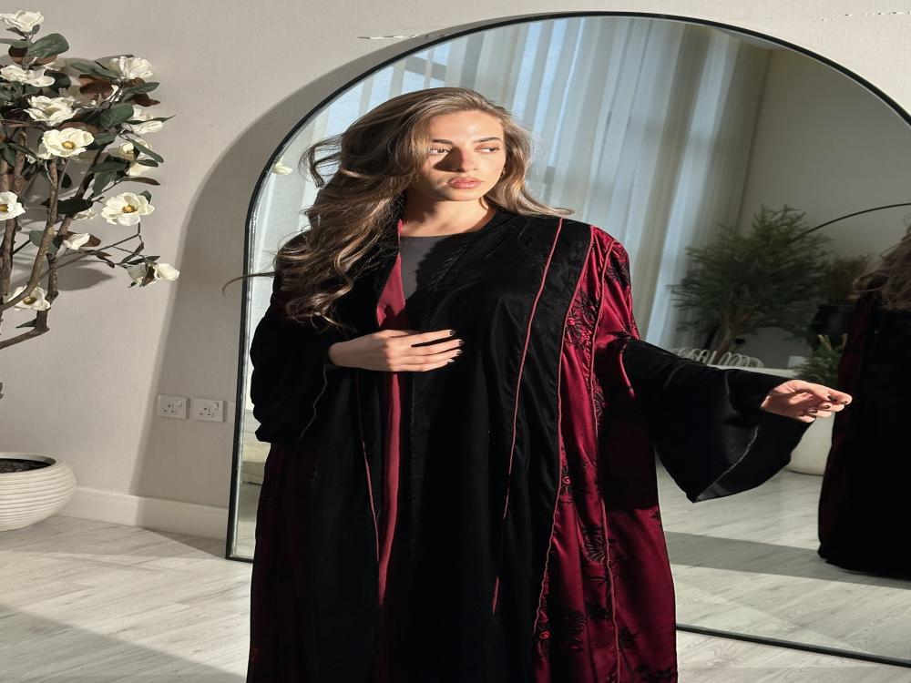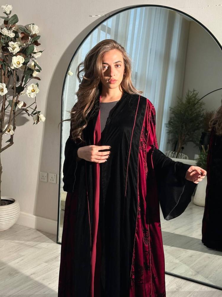 تتميز بنسيجها المخملي الناعم الذي يضفي عليها ملمسًا دافئًا وجذابًا، بالإضافة إلى تفاصيلها الانيقه الانثويه اللون العنابي هو لون عميق وغني يعكس الأنوثة والجاذبية. النسيج المخمل: يضفي على العباية مظهرًا فاخرًا وأنيقًا